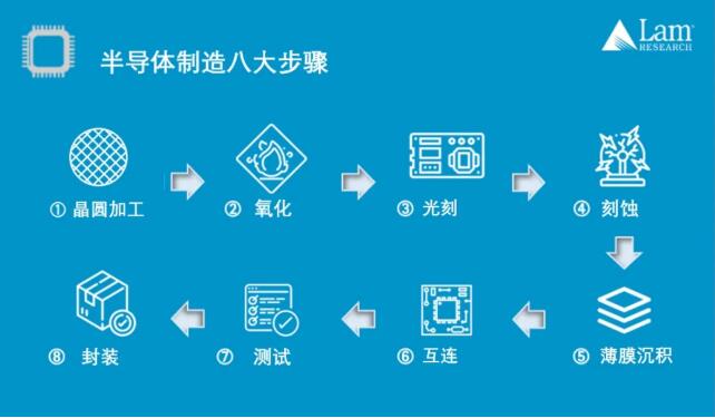 每個半導體產品的制造都需要數(shù)百個工藝,泛林集團將整個制造過程分為八個步驟:晶圓加工-氧化-光刻-刻蝕-薄膜沉積-互連-測試-封裝。
