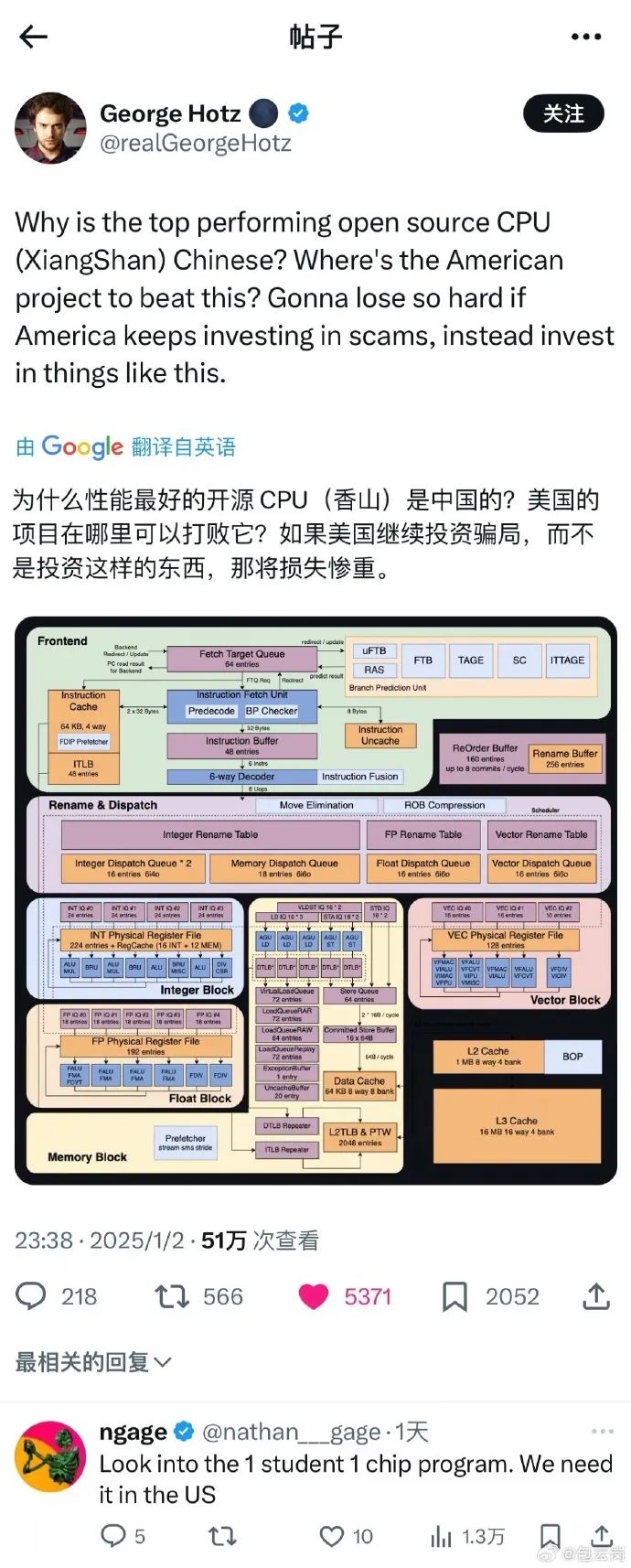 1)開源CPU,在硅谷科技圈很多人看來,是一件有可能影響國家相關產業(yè)發(fā)展的事。顯然我們在多年前就這么認為,所以才會在5年前便啟動香山開源CPU核項目,而現(xiàn)在更堅定了這個信念。這條X消息某種程度上是從側面表達了對香山項目的一種肯定。