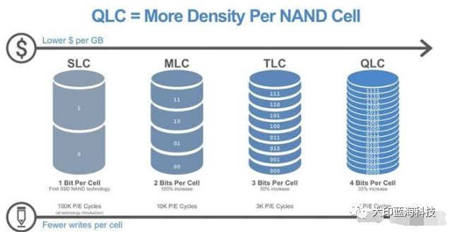 首先,SLC、MLC、TLC及近2年新出的QLC四者是固態(tài)硬盤NAND閃存的不同類型。常說的固態(tài)硬盤顆粒MLC和TLC的區(qū)別如下: