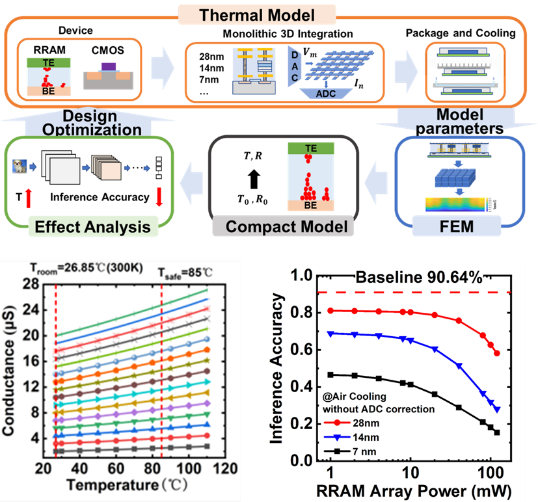 基于RRAM的存算一體芯片近年來得到了廣泛關注與研究,芯片的集成規(guī)模和算力不斷提高。但是,芯片的功耗密度,也在不斷提高。并且由于RRAM陣列在計算過程中會全并行開啟,造成局部的高功耗與熱點。而RRAM器件作為模擬器件,其電導對于溫度是敏感的,溫度的升高會造成RRAM電導的漂移,進而引起芯片計算精度下降。該工作對基于 RRAM 的存算一體芯片進行了多尺度熱建模,對影響溫度分布的散熱方式、技術節(jié)點、RRAM陣列功耗、ADC與DAC功耗等多種因素進行了評估。并結合 RRAM 緊湊模型研究了RRAM器件隨溫度的電導漂移,及其對神經(jīng)網(wǎng)絡的精度退化的影響,并提出了有效的改善方法。該研究對基于RRAM的存算一體芯片運行深度神經(jīng)網(wǎng)絡,改善溫度引起的計算精度下降具有重要參考價值。該工作以 A Multi-Scale Thermal Modeling of RRAM-based 3D Monolithic-Integrated Computing-in-Memory Chips 為題發(fā)表, 集成電路學院博士生馬阿旺為[敏感詞]作者,高濱副教授為通訊作者。