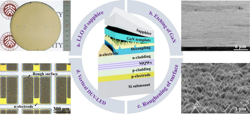 北京大學(xué)許福軍、沈波團(tuán)隊針對III族氮化物深紫外發(fā)光二極管(DUV-LED)光提取效率低下的難題,創(chuàng)新發(fā)展了一種基于GaN/藍(lán)寶石模板的應(yīng)力解耦方法,實現(xiàn)了DUV-LED外延結(jié)構(gòu)2、4英寸晶圓級無損傷剝離,并成功制備出垂直結(jié)構(gòu)器件,有效提升了光提取效率,200 mA注入電流下,峰值發(fā)光波長280 nm的深紫外LED光輸出功率達(dá)65.2 mW。