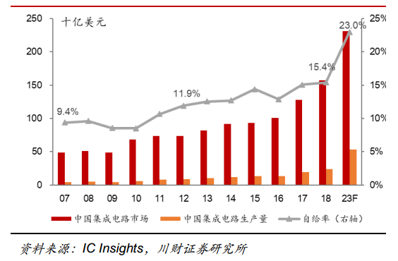 雖然我國(guó)半導(dǎo)體市場(chǎng)呈現(xiàn)快速增長(zhǎng)趨勢(shì),但是中國(guó)自給率較低。根據(jù) ICInsights [敏感詞]數(shù)據(jù), 2018 年我國(guó)半導(dǎo)體自給率約 15.4%,較 2012 年的 11.9%雖有較大提升,但是仍然存在供給能力不足的問題,預(yù)計(jì) 2023 年我國(guó)自給率將達(dá)到 23%,因此我國(guó)半導(dǎo)體市場(chǎng)進(jìn)口替代存在較大市場(chǎng)空間。