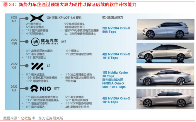 “硬件預(yù)埋,軟件升級(jí)”成為車企主流策略,智能化頭部車企在新一代車型中預(yù)置大算力芯片。汽車產(chǎn)品具備較長(zhǎng)的生命周期,一般為 5-10 年,車載計(jì)算平臺(tái)的算力上限決定車輛生命周期內(nèi)可承載的軟件服務(wù)升級(jí)上限。相較而言軟件迭代更快,因此智能駕駛軟件迭代周期與硬件更換周期存在錯(cuò)位。為保證車輛在全生命周期內(nèi)的持續(xù)軟件升級(jí)能力,主機(jī)廠在智能駕駛上采取“硬件預(yù)置,軟件升級(jí)”的策略,通過(guò)預(yù)置大算力芯片,為后續(xù)軟件與算法升級(jí)優(yōu)化提供足夠發(fā)展空間。以蔚來(lái)、智己、威馬、小鵬為代表的主機(jī)廠在新一代車型中均將智能駕駛算力提升至 500-1000Tops 級(jí)別。