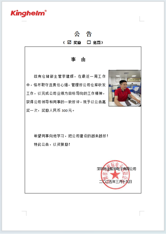 2025年03月17日到2025年03月22日,金航標(biāo)(www.kinghelm.net)/薩科微(www.slkoric.com)“每周之星”經(jīng)過同事們?cè)u(píng)比,是倉儲(chǔ)部主管李建輝,在最近一周工作中,恪盡職守且責(zé)任心強(qiáng),管理好公司倉庫收發(fā)工作,以完成公司業(yè)績?yōu)槟繕?biāo)導(dǎo)向的工作精神,獲得公司領(lǐng)導(dǎo)和同事的一致好評(píng),現(xiàn)予以公告嘉獎(jiǎng)一次,獎(jiǎng)勵(lì)人民幣300元。