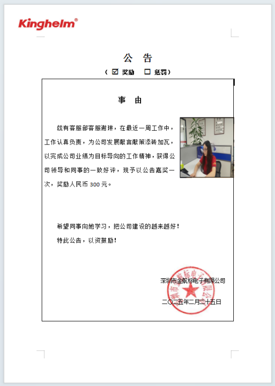 2025年02月24日到2025年02月28日,金航標(biāo)(www.kinghelm.net)/薩科微(www.slkoric.com)“每周之星”經(jīng)過(guò)同事們?cè)u(píng)比,金航標(biāo)/薩科微的“每周之星”是客服部謝琳,在最近一周工作中,工作認(rèn)真負(fù)責(zé),為公司發(fā)展獻(xiàn)言獻(xiàn)策添磚加瓦,以完成公司業(yè)績(jī)?yōu)槟繕?biāo)導(dǎo)向的工作精神,獲得公司領(lǐng)導(dǎo)和同事的一致好評(píng),現(xiàn)予以公告嘉獎(jiǎng)一次,獎(jiǎng)勵(lì)人民幣300元。