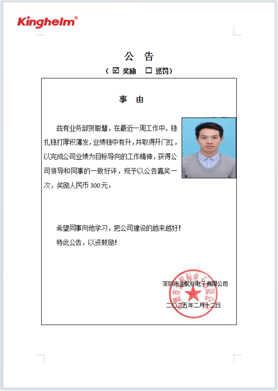 2025年02月10日到2025年02月14日,金航標(biāo)(www.kinghelm.net)/薩科微(www.slkoric.com)“每周之星”經(jīng)過(guò)同事們?cè)u(píng)比,金航標(biāo)/薩科微“每周之星”是業(yè)務(wù)部賀聰慧,在最近一周工作中,穩(wěn)扎穩(wěn)打厚積薄發(fā),業(yè)績(jī)穩(wěn)中有升,并取得開(kāi)門紅,以完成公司業(yè)績(jī)?yōu)槟繕?biāo)導(dǎo)向的工作精神,獲得公司領(lǐng)導(dǎo)和同事的一致好評(píng),現(xiàn)予以公告嘉獎(jiǎng)一次,獎(jiǎng)勵(lì)人民幣300元。