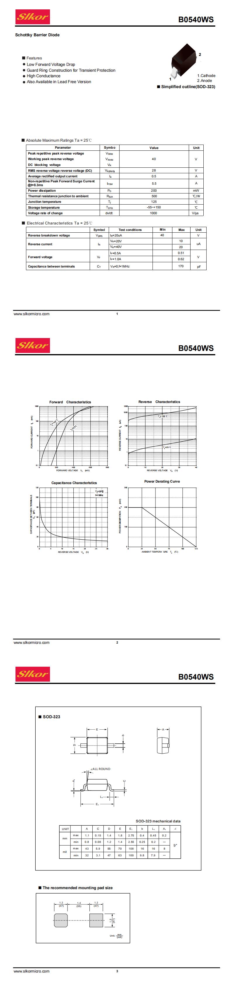- 低正向電壓降:B0540WS在導(dǎo)通狀態(tài)下具有較低的電壓降,有助于降低整體能耗。
