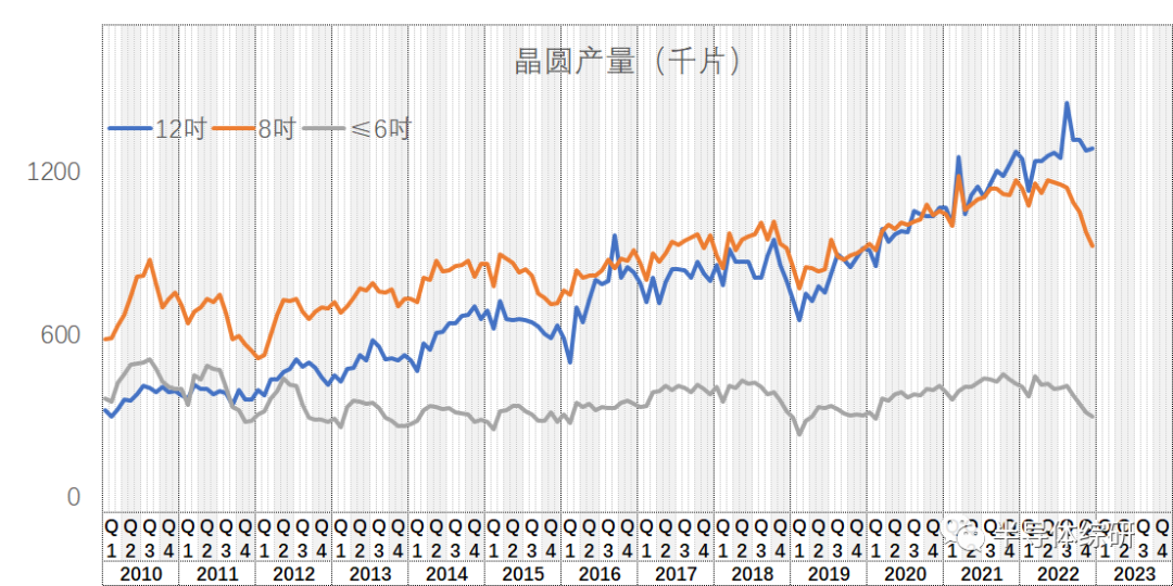 從生產(chǎn)數(shù)量上看,其中12吋晶圓產(chǎn)量還算比較穩(wěn)定,但8吋和6吋的產(chǎn)值從年中開始已經(jīng)持續(xù)暴跌