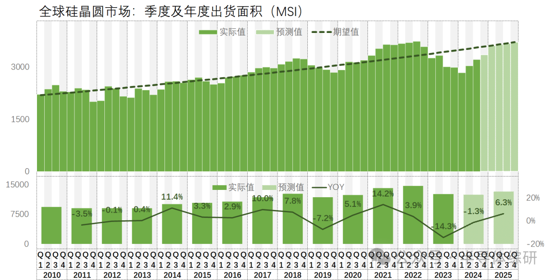 我預(yù)計(jì)這個(gè)敞口在2025年會(huì)進(jìn)一步縮小,所以硅晶圓的出貨量基本上保持溫和增長(zhǎng)。我個(gè)人預(yù)測(cè)測(cè)年度出貨量同比增長(zhǎng)為6.3%