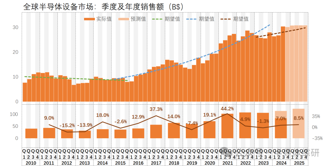 按照我的推測(cè),2025年全球半導(dǎo)體設(shè)備市場(chǎng)約為1234億美金,同比增長(zhǎng)8.5%